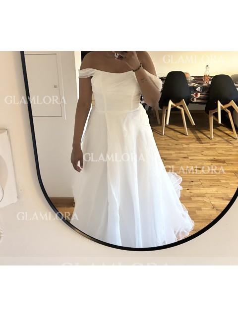 This wedding dress is an A-line silhouette with an off-the-shoulder neckline and sleeveless design. It features elegant pleats and is crafted from organza, with a chapel train for added grace and charm. Perfect for brides looking for a classic and timeless wedding gown.