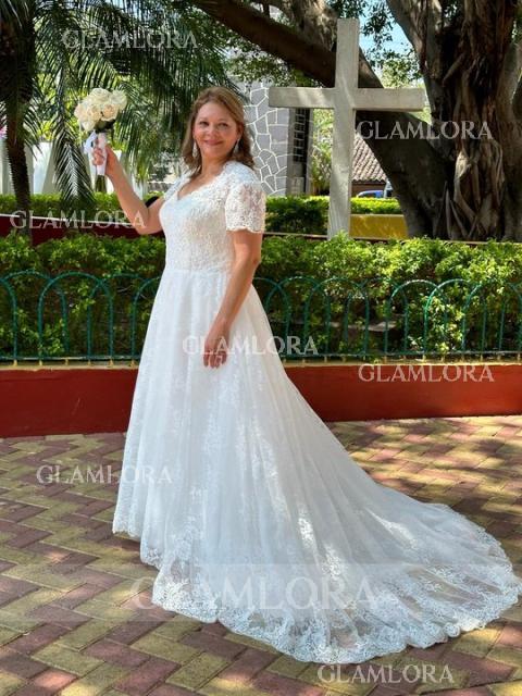 A-line Sweetheart Short Sleeves Court Train Trendy Lace Wedding Dress #GLHS0265