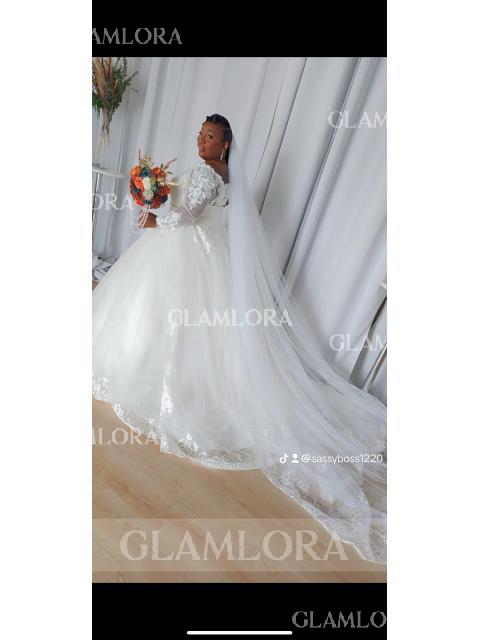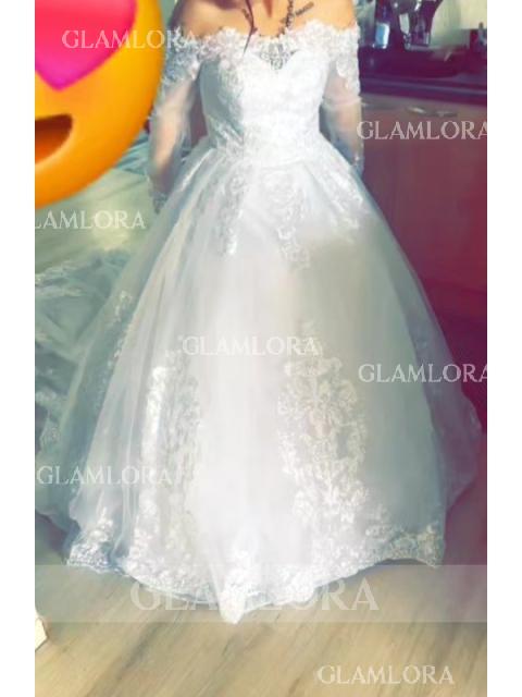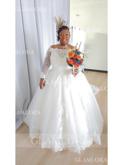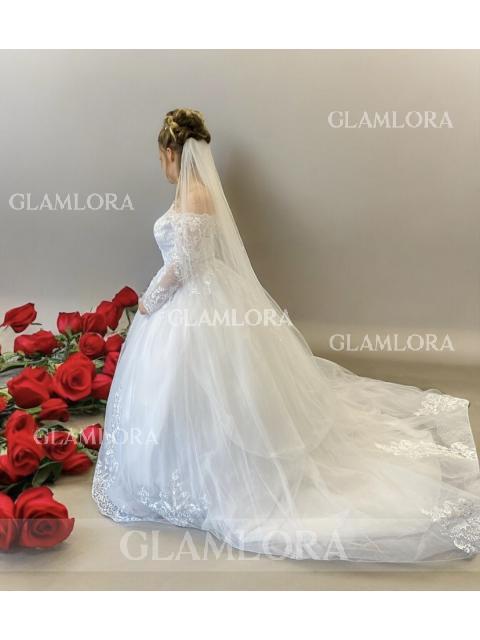 • Ball-Gown Princess Off-the-Shoulder Long Sleeves Cathedral Train Ethereal Tulle Wedding Dress With Applique
