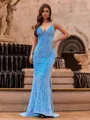A form-fitting sheath dress with a V-neckline, sleeveless design, and adorned with luxurious velvet and sequins. It features a court train for added elegance.