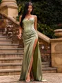 A glamorous sheath prom dress featuring a sweetheart neckline and sleeveless design adorned with delicate lace appliques. Crafted from silk-like satin, it flows into a graceful sweep train, creating a romantic and elegant silhouette perfect for formal events and special occasions.
