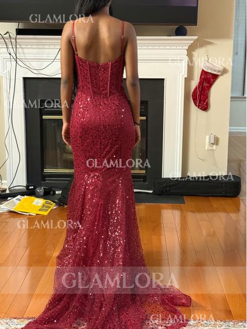 Sheath/Column Spaghetti Straps Sleeveless Sweep Train Twinkling Sequins Corset Dress With Slit CA$190.40 (6)