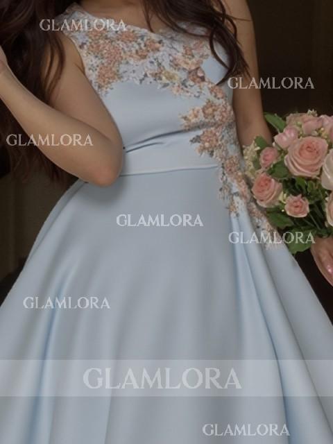 Ball-gown satin dress with one-shoulder neckline and charming floral details, showcasing a graceful tea-length style.