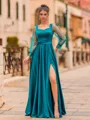 • Delicate A-Line Charmeuse Ruffles Square Long Sleeves Floor-Length Prom Dress