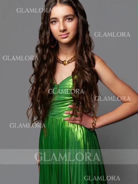 An A-line straight pleated dress in metallic satin, featuring a sleek silhouette and a sweep train. The pleats add texture and movement, while the metallic fabric offers a shiny, luxurious finish. The straight cut provides a clean, modern look, making it ideal for formal occasions or evening events.