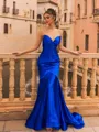 An enchanting mermaid prom dress crafted from smooth, silk-like satin, featuring elegant pleated detailing and a romantic sweetheart neckline. The sleeveless design highlights its sophisticated silhouette, while the sweep-train hem adds a graceful, eye-catching finish perfect for making a stylish entrance.