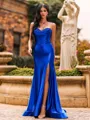 A romantic A-line prom dress featuring a sweetheart neckline and sleeveless design adorned with delicate lace appliques. Crafted from silk-like satin, the flowing skirt extends into a graceful sweep train, creating an elegant and timeless silhouette perfect for formal events and special occasions.
