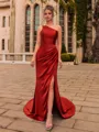 A glamorous sheath prom dress crafted from a luxe combination of satin and chiffon, featuring elegant pleated detailing and a striking one-shoulder neckline. The sleeveless design enhances its sophisticated silhouette, while the sweep-train hem creates a graceful, flowing finish perfect for making a stylish and memorable entrance.