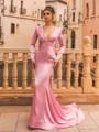• Grand Sheath Silk Like Satin Pleated V-Neck Long Sleeves Sweep Train Prom Dress