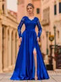 A stunning A-line prom dress crafted from smooth, luxurious satin, adorned with delicate lace appliques for added elegance. The refined V-neckline and long sleeves bring a touch of sophistication, while the floor-length silhouette creates a graceful, eye-catching look perfect for making a stylish entrance.