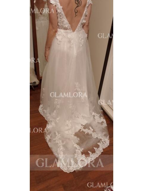 • Modest A-line Princess V-Neck Sleeveless Court Train Tulle Wedding Dress With Applique