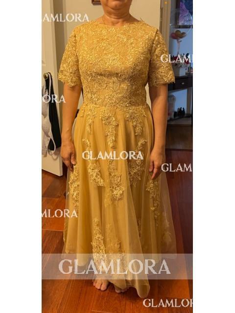 • Polished A-Line Chiffon Lace Scoop Short Sleeves Tea-Length Mother of the Bride Dress