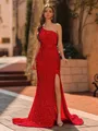A form-fitting sheath dress with a one-shoulder neckline, a sleeveless design, and adorned with luxurious velvet and shimmering sequins. It features a sweeping train for added elegance.