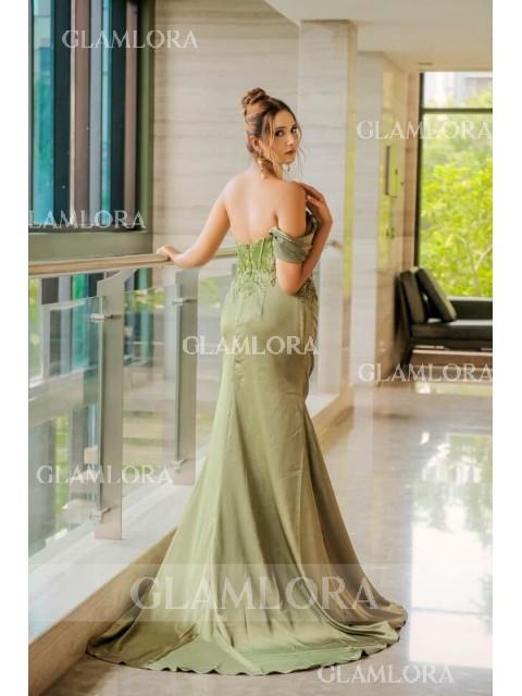 This dress is a sheath-style gown featuring a striking one-shoulder design and a sleeveless silhouette. Crafted from luxurious silk-like satin, it has a smooth and elegant finish. The dress is adorned with intricate lace appliques, adding texture and sophistication. The corset-style bodice enhances the figure with a structured fit, while the court train adds a touch of drama and grace, making it an ideal choice for formal events and special occasions.