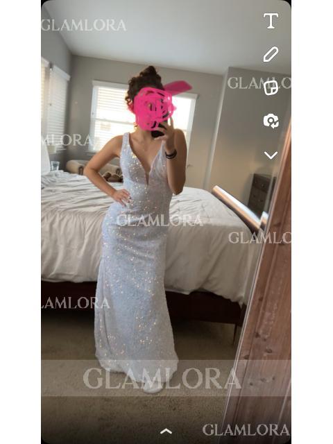 • Sheath/Column V-Neck Sleeveless Twinkling Sweep Train Velvet Sequins Dress