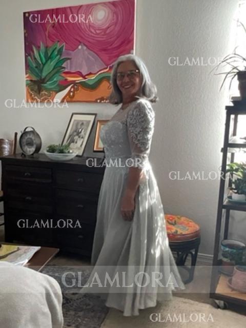 • Stunning A-Line Chiffon Lace Scoop 3/4 Sleeves Tea-Length Mother of the Bride Dress