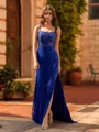 A form-fitting sheath dress featuring delicate spaghetti straps and a sleeveless design, adorned with shimmering sequins. It includes a sweeping train for added elegance.