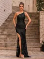 An unforgettable sheath prom dress crafted from intricate lace, featuring a chic one-shoulder neckline for a modern, elegant touch. The sleeveless design highlights the dress's sleek silhouette, while the sweep-train hem adds a graceful, sophisticated finish perfect for making a stunning entrance.